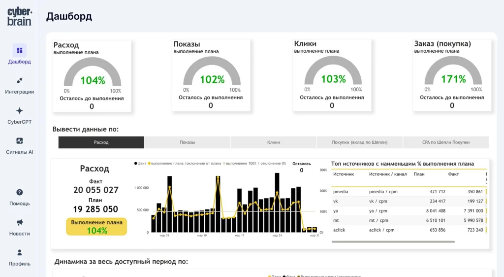 Дашборд — единая точка принятия решений. Детальная аналитика от обзора кампаний до рекомендаций по оптимизации.