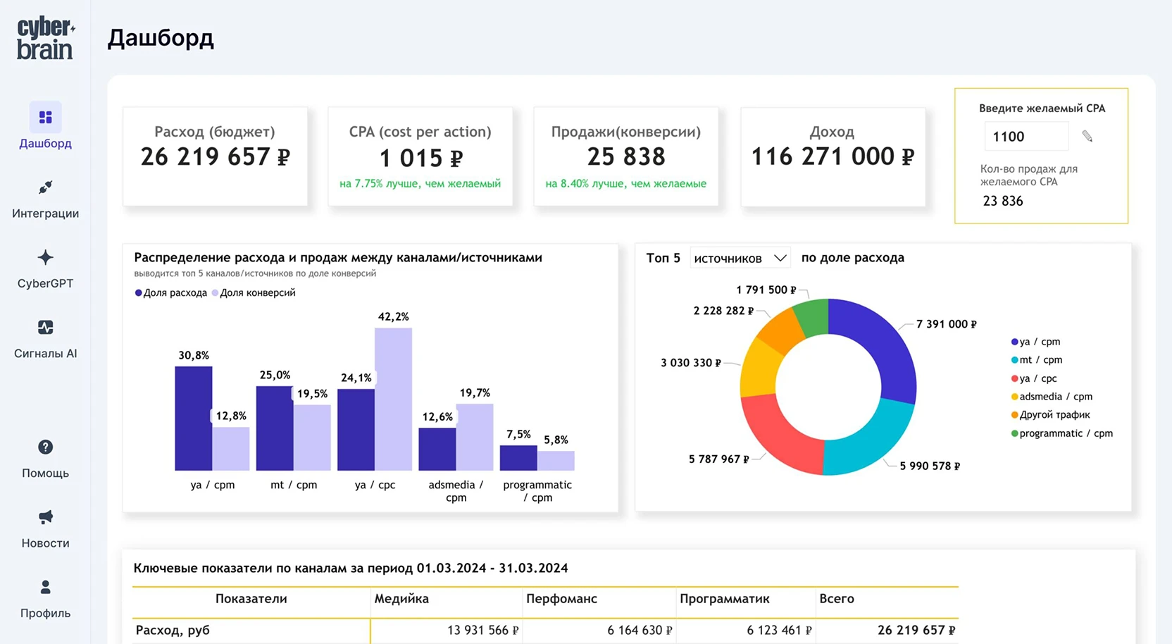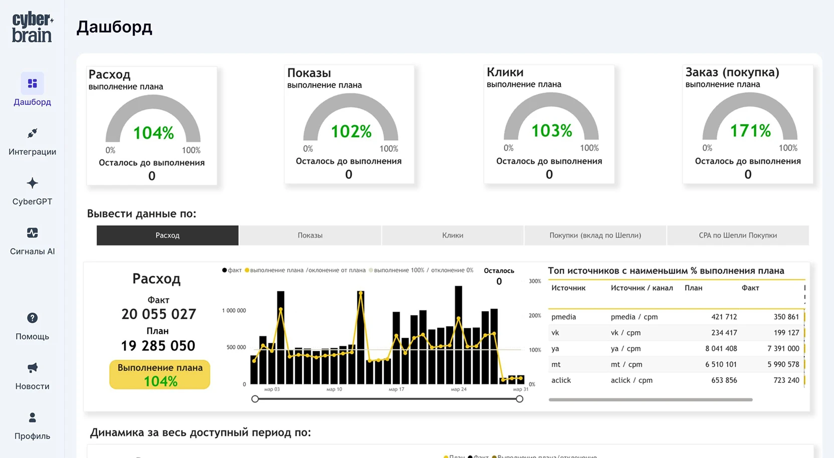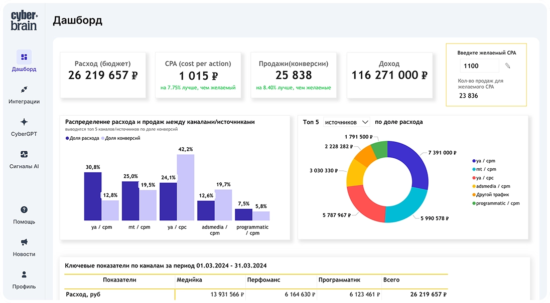 Эффективность от показов до продаж и CPA с детализацией по каждому каналу и площадке