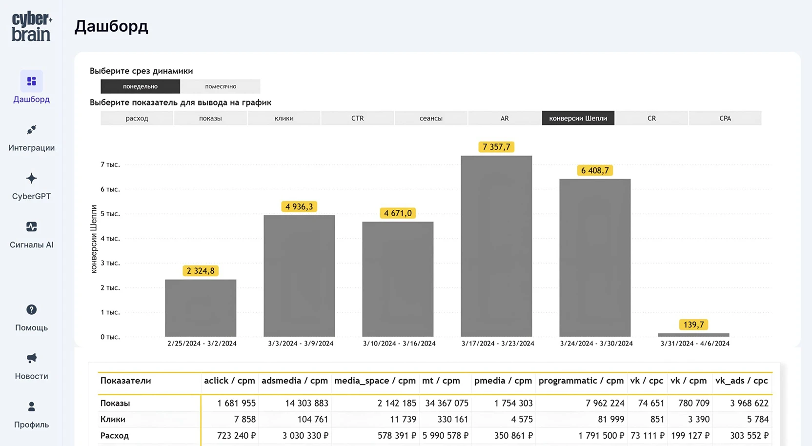 Ключевые метрики по каналам: расходы, клики, CTR, AR, конверсии и др. по неделям / месяцам