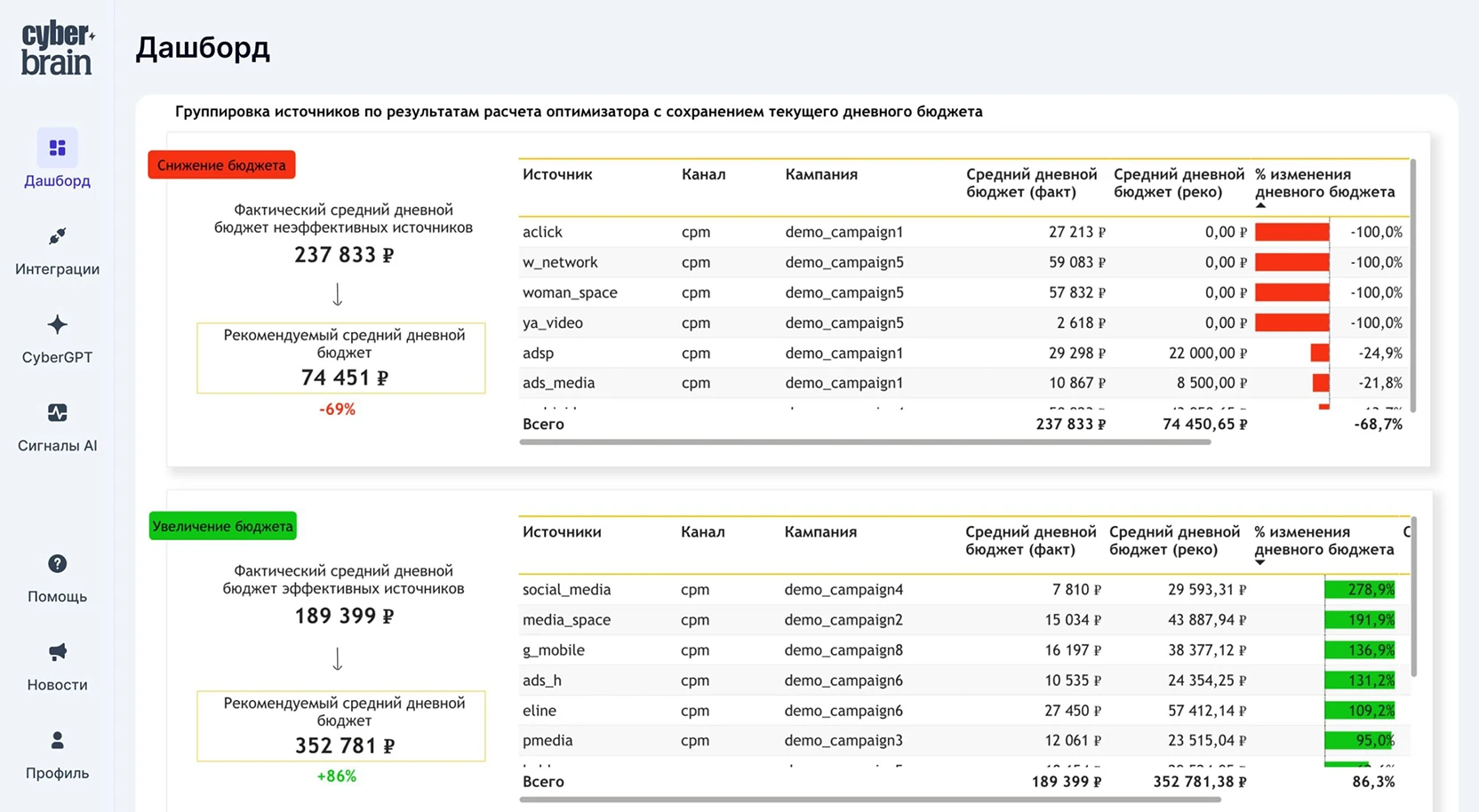 Распределение бюджетов между кампаниями с рекомендациями и прогнозом эффективности